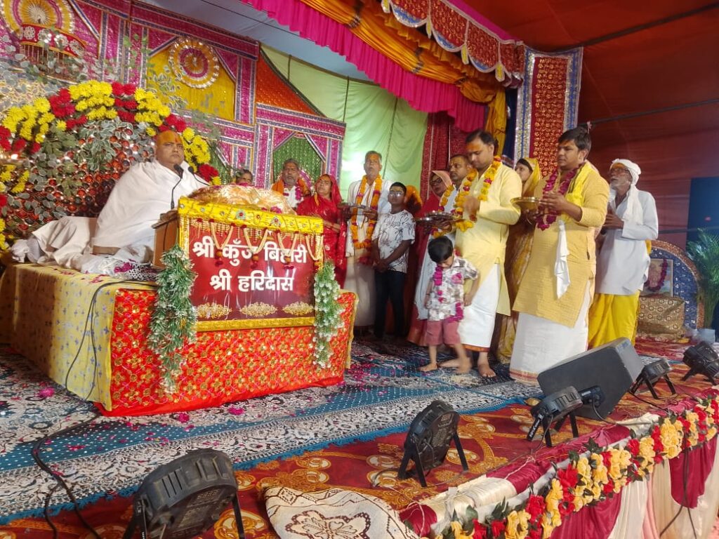 इससे पूर्व पारीक्षित ममता अजय अग्रवाल, दीर्घा विजयी चौधरी,गीता राजेंद्र अग्रवाल ,मुस्कान धीरज कुशवाहा, रमा आशाराम कुशवाहा, राजेश्वरी कोमल सिंह सिजरिया, जयकुंवर लालाराम कुशवाहा, सुनीता रामसिंह, फूलवती बृजमोहन साहू,रज़नी मारुति दीक्षित एवं गिरवरधारी जू मंदिर के पुजारी मदनमोहन दास एवं राधाबल्लभ महाराज श्रीधाम वृंदावन ने महाराजश्री का माल्यार्पण कर श्रीमद भागवत पुराण की आरती उतारी।अंत में व्यवस्थापक परमानंद दास ने सभी का आभार व्यक्त किया।रात्रि में श्रीधाम वृंदावन धाम से पधारे श्रीहितआदर्श कृष्णकला भक्तमाल चरित्र रामलीला मंडल के कलाकारों ने स्वामी देवेंद्र वशिष्ठ के निर्देशन में मुनि आगमन, ताडका सुवाऊ मारीच वध,गंगा अवतरण एवं नगर दर्शन की लीला का मनमोहक मंचन किया।
